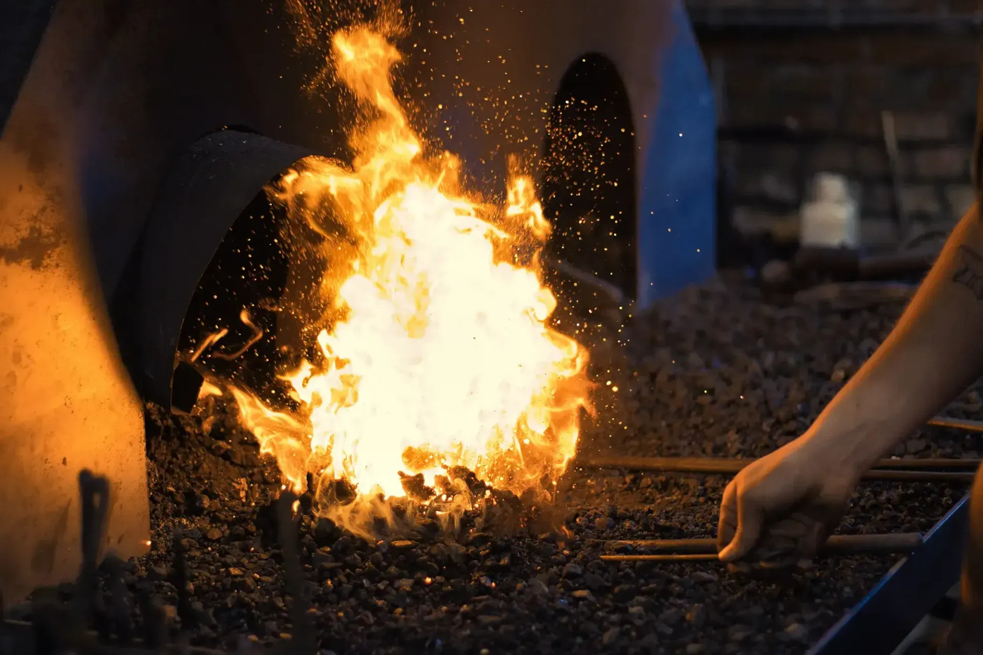 - Een beschadigde maar herstellende smidse: geblakerde muren, een nieuw aambeeld, Conrad die met vastberaden blik het eerste stuk staal na de brand smeedt.